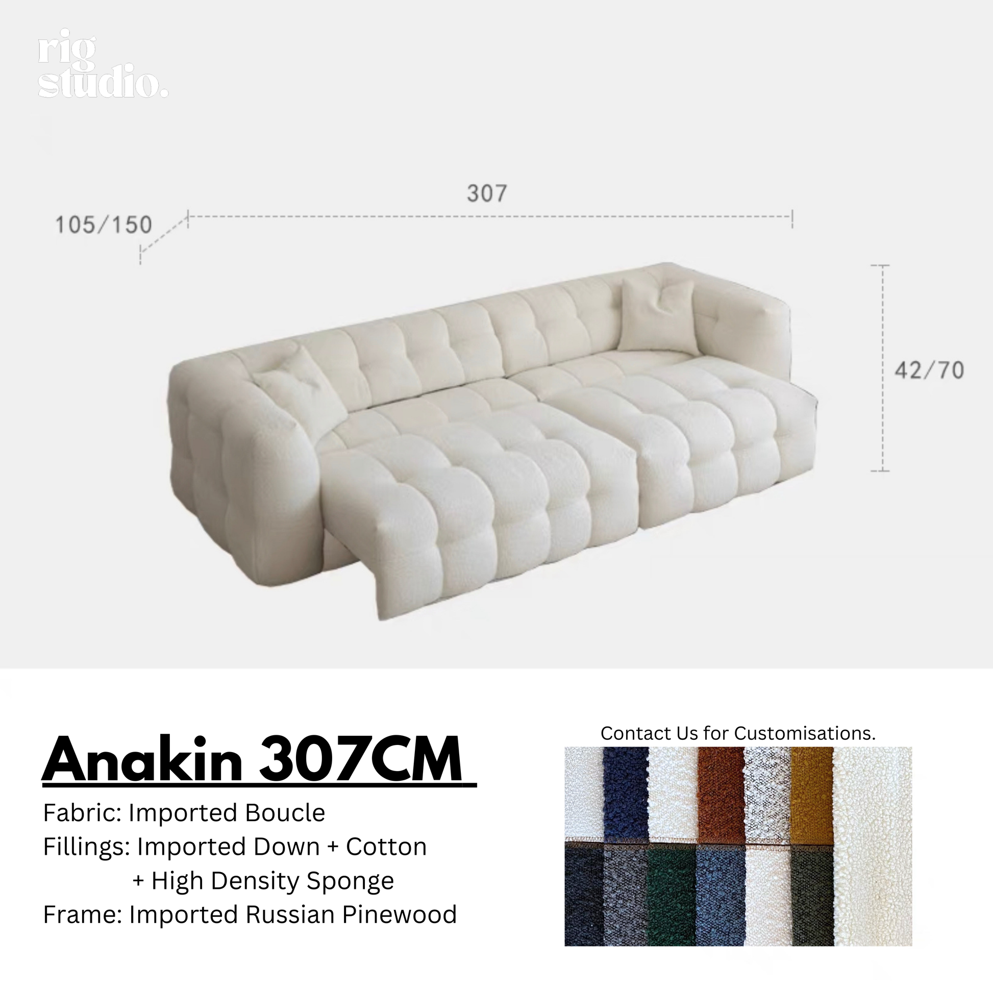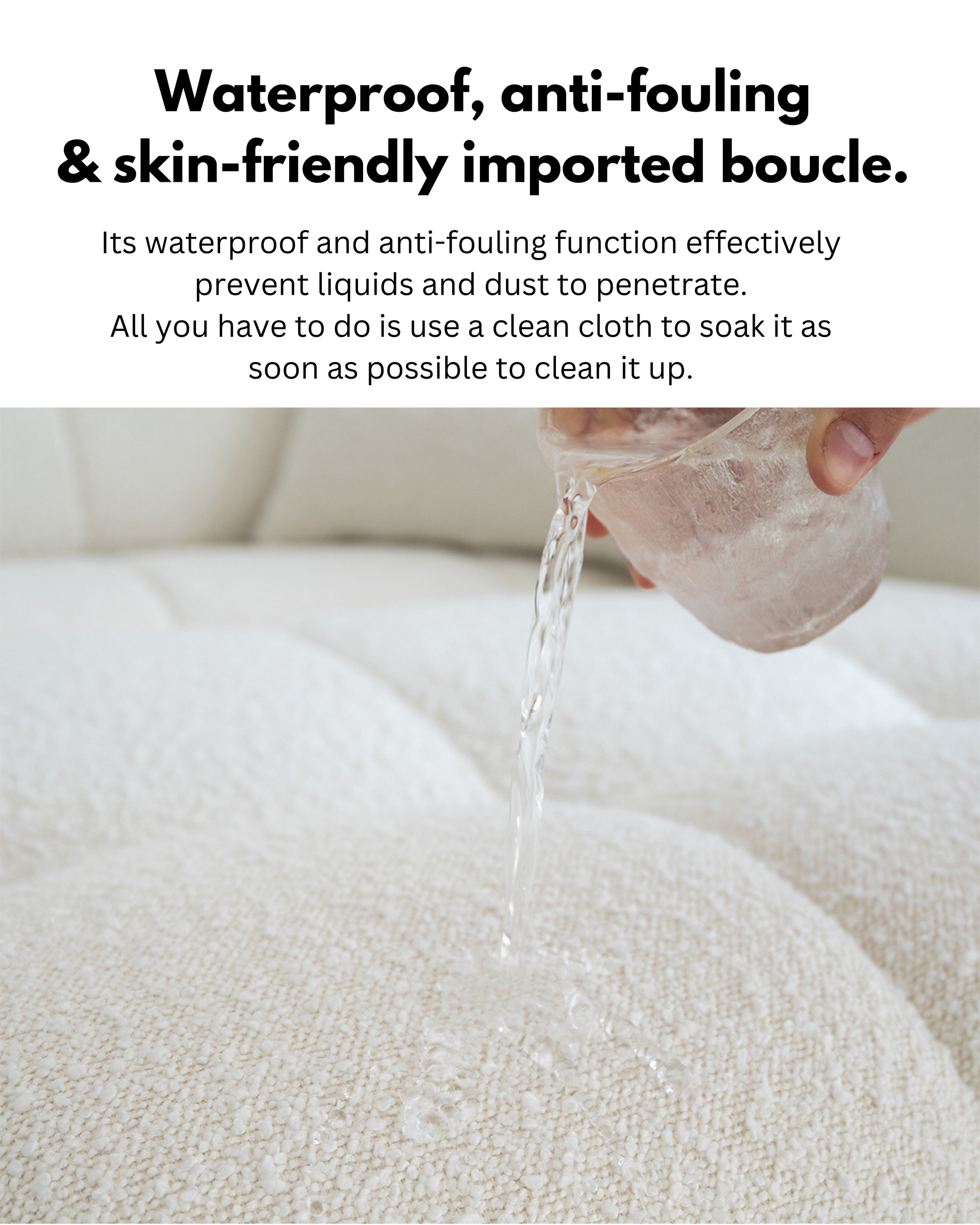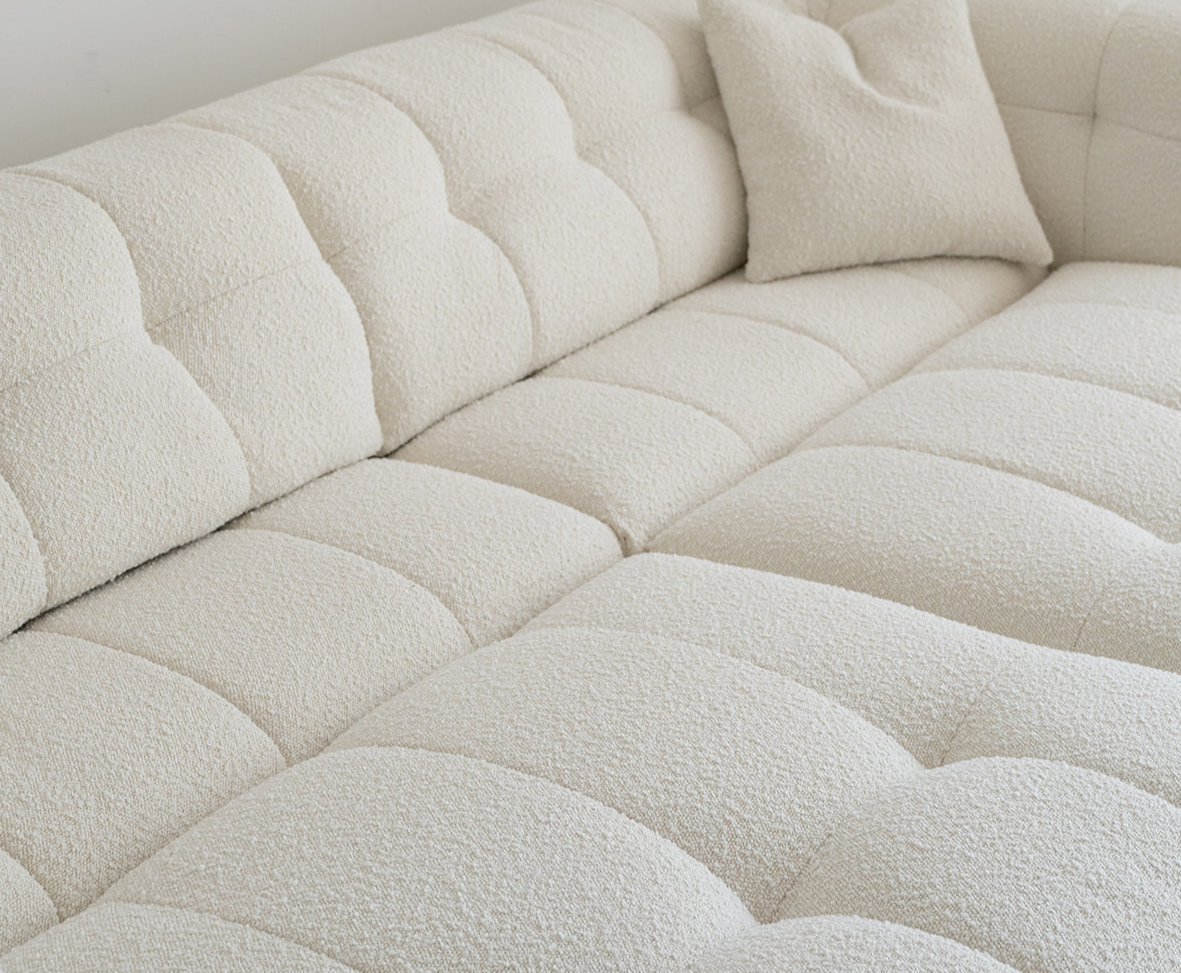Upholstered in imported boucle fabric, known for its softness and durability, the sofa is filled with 45D high-density foam and cotton for luxurious comfort. The sofa comes equipped with reliable hardware for long-lasting performance.