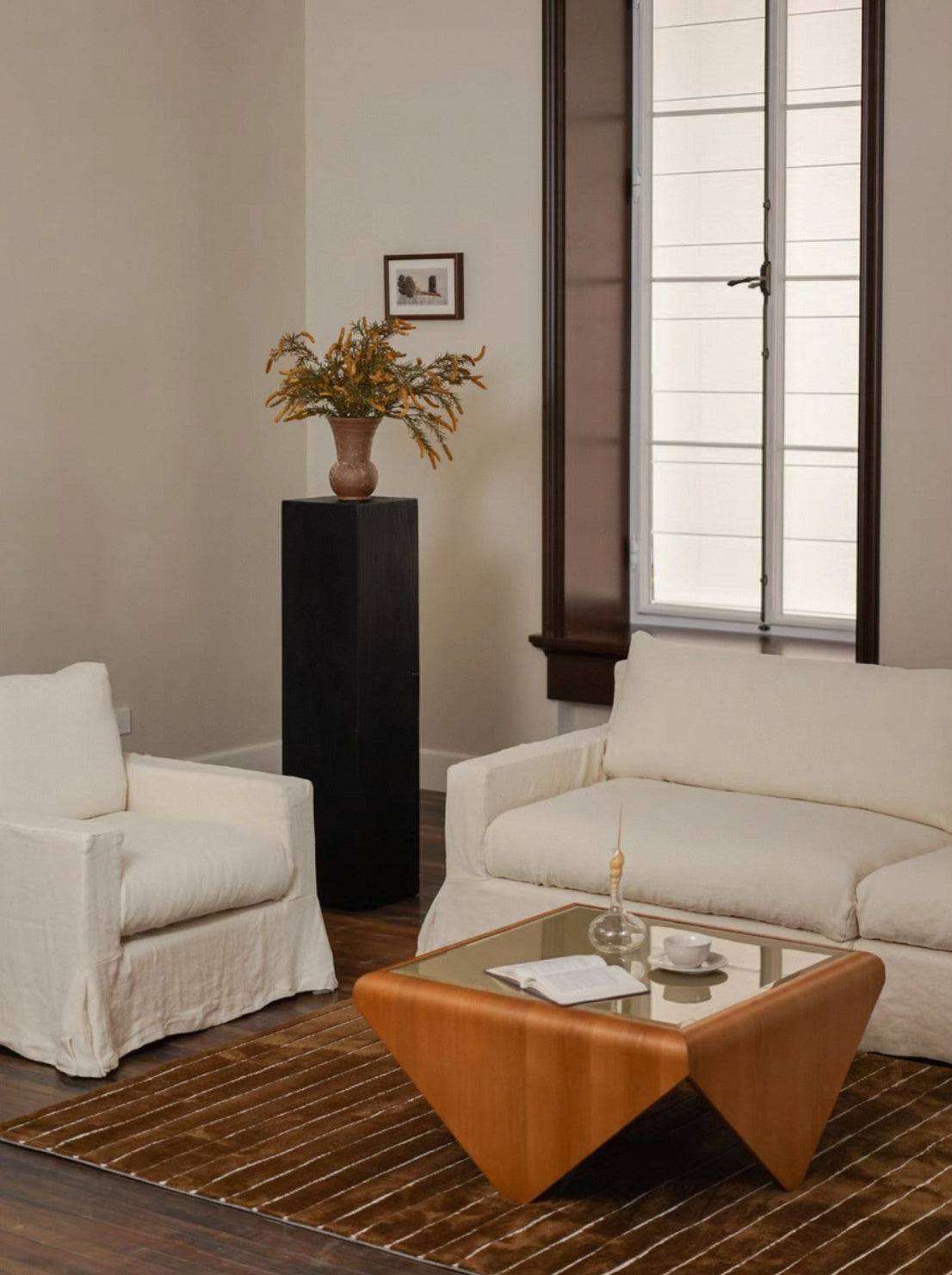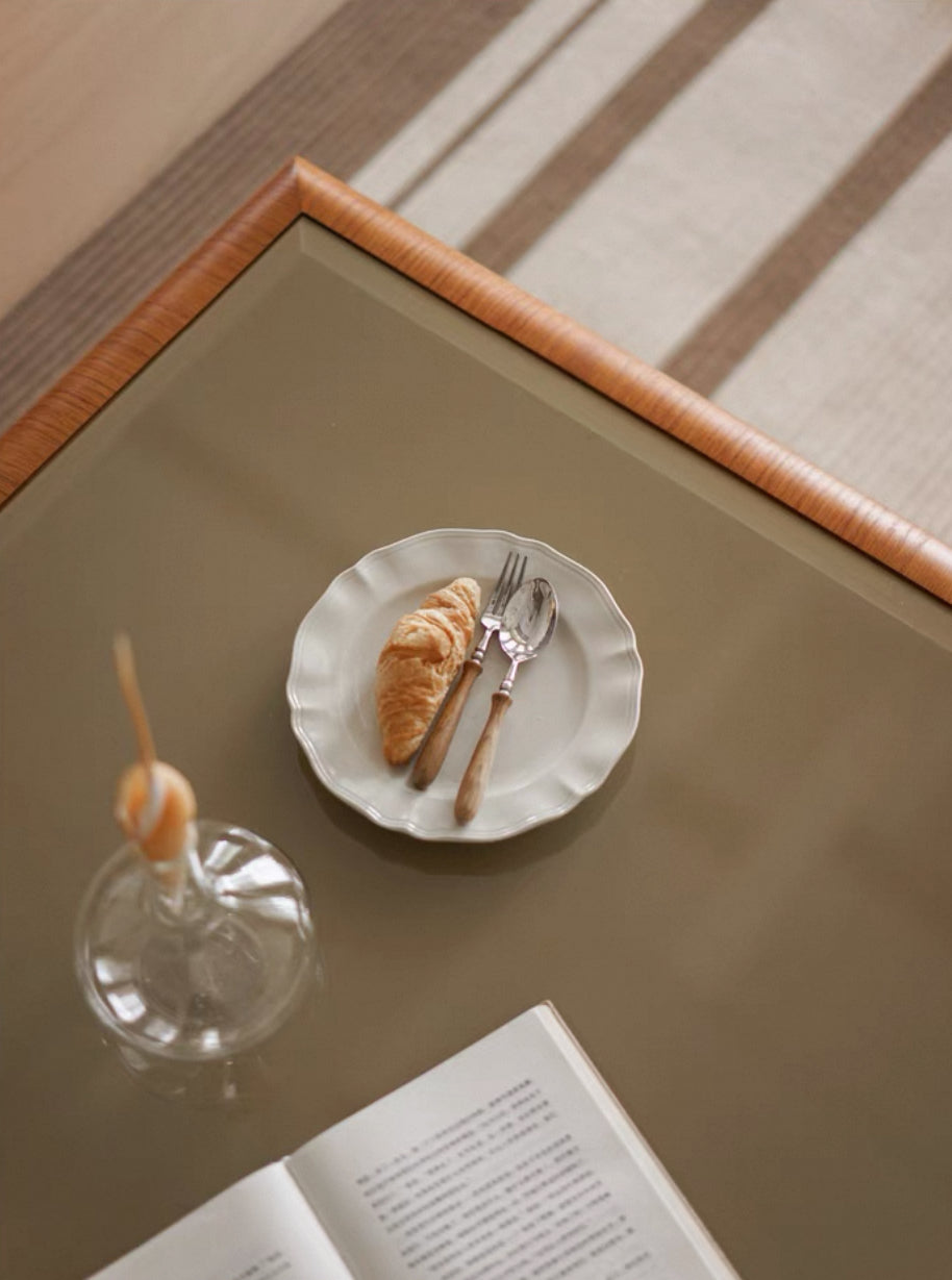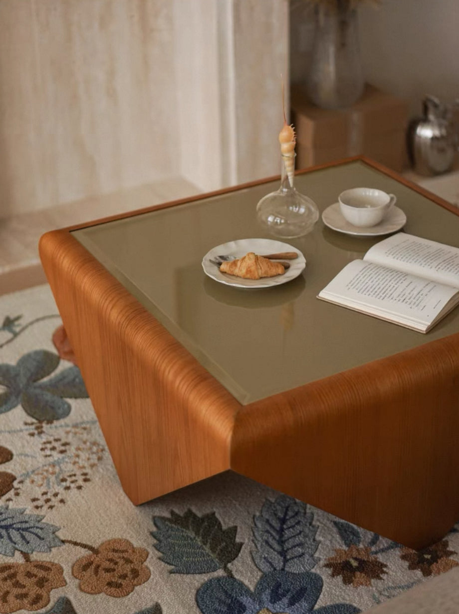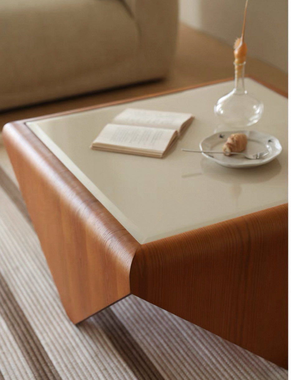 The Celine Coffee Table features a sleek, minimalist design with a multi-layered board veneered in red oak, offering a warm, smooth touch and clear wood grain. The heat-pressed solid wood multi-layer board, made with an eucalyptus core, boasts a unique shape and smooth lines. The rounded corners enhance safety, while the overall structure is stable and durable, providing excellent weight support. The tempered glass tabletop ensures high safety and stability, and the non-slip foot pads prevent movement, protecting your floors from scratches during relocation.