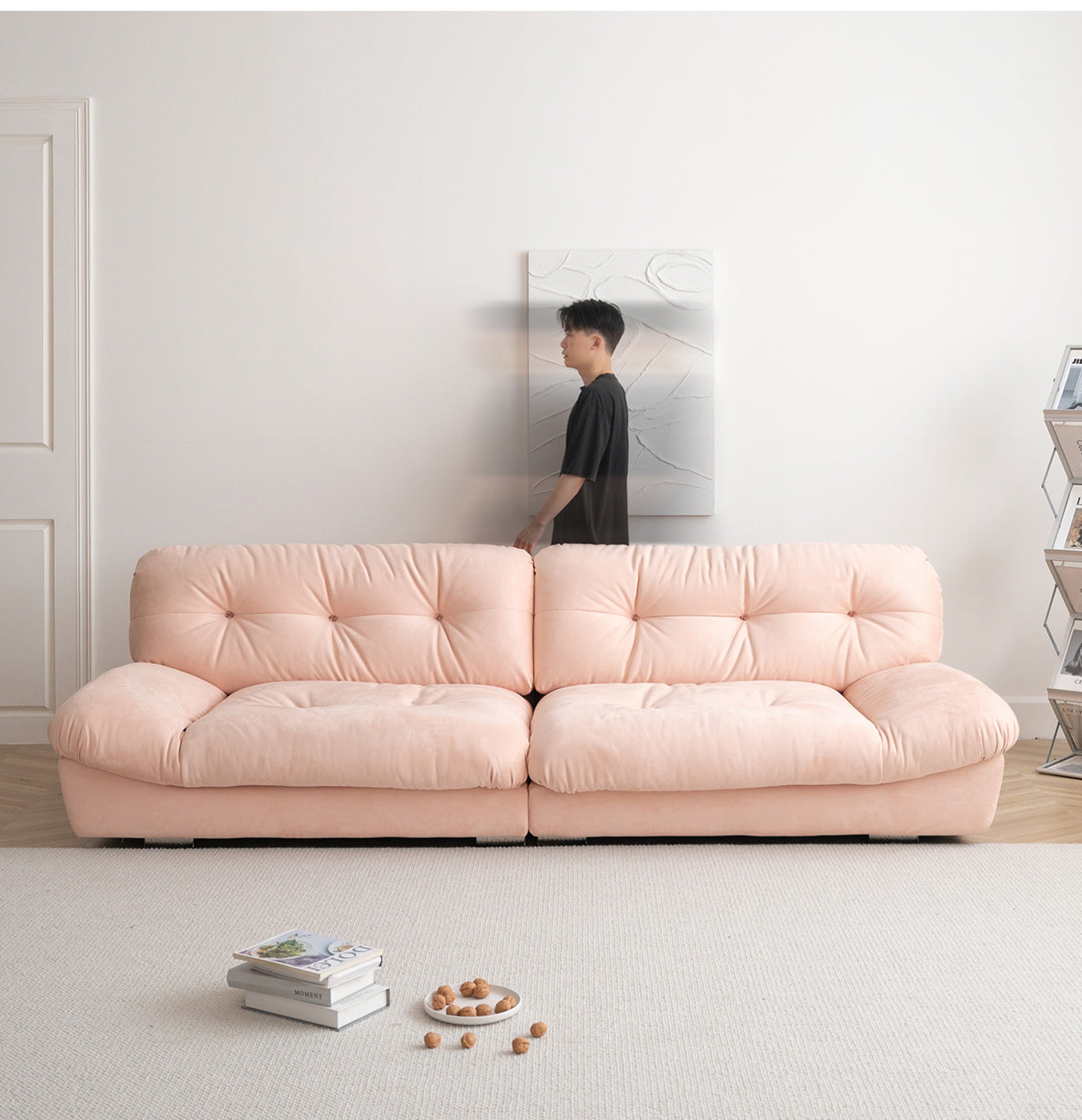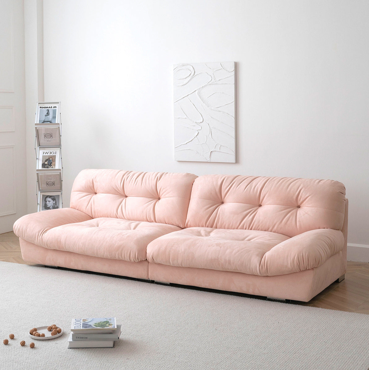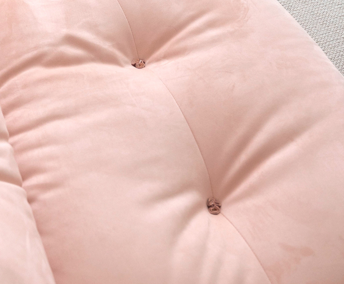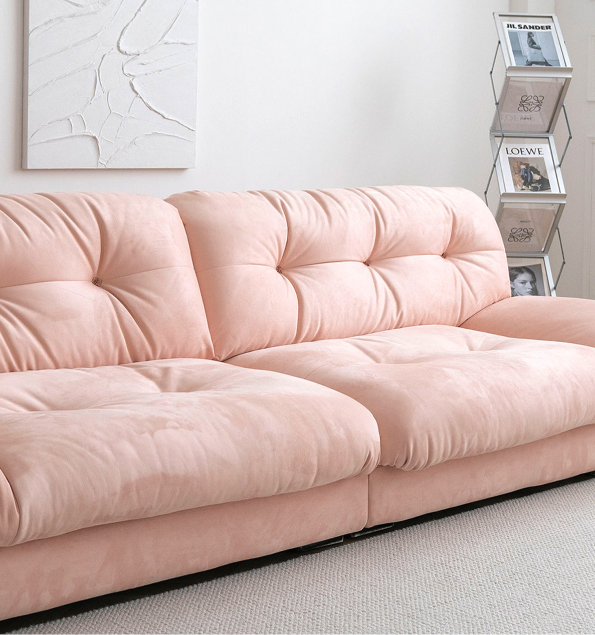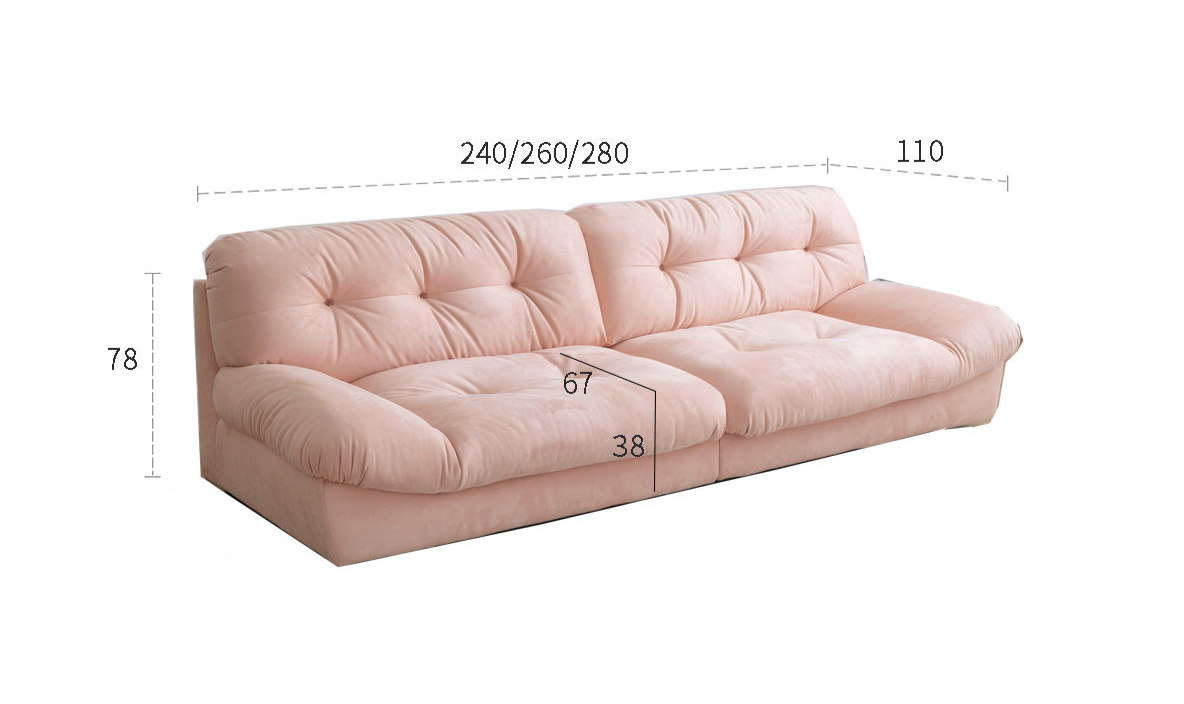 Crafted from imported suede fabric, filled with 45D high-density foam and goose down, and supported by a durable Russian pine wood frame, it offers softness and lasting stability. The button tufting adds elegance, while the plush yet supportive cushions provide a cloud-like seating experience. Perfect for those seeking luxury, comfort, and style in their home.